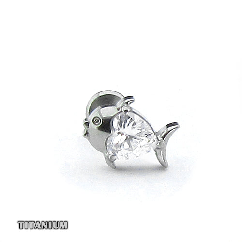 Titanium sa ribicom i Cubic Zirconia kristalom veličine 4. Debljina posta 1,2mm, dužina posta 6mm, veličina ribice 8mm. Unutrašnji navoj na postu za lakše postavljanje vrha nakita. Ovaj lijepi nakit može da se koristi kao pirsing za uvo.