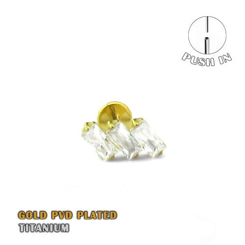 Titanium presvučen zlatom tehnologijom vakuma PVD, za dugotrajnu postojanost sa tri baguette CZ kristala, svaki veličine 4mm x 2mm. Debljina posta 1mm, dužina posta 6mm, ukupna veličina vrha 9mm. Push in sistem bez navoja za lagano postavljanje i skidanje vrha nakita Može da se koristi kao pirsing za uvo.