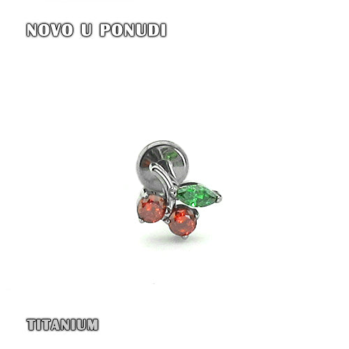 Titanium sa CZ kristalnim trešnjicama veličine 5mm. Debljina posta 1,2mm, dužina posta 6mm. Unutrašnji navoj na postu za lakše postavljanje vrha nakita. Izuzetno lijepi nakit. Može da se koristi kao pirsing za uvo.