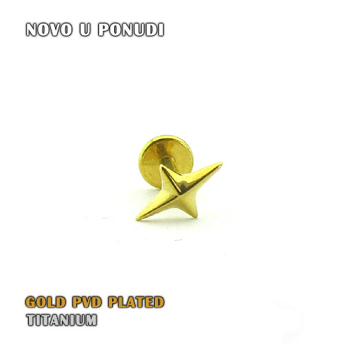 Titanium presvučen zlatom tehnologijom vakuma PVD, za dugotrajnu postojanost sa zvijezdom veličine 7mm. Debljina posta 1,2mm, dužina posta 6mm. Unutrašnji navoj na postu za lakše postavljanje vrha nakita. Može da se koristi kao pirsing za uvo.