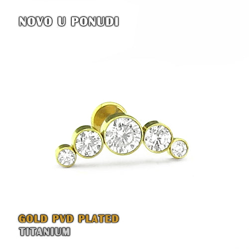 Titanium presvučen zlatom tehnologijom vakuma PVD, za dugotrajnu postojanost sa pet kristala, centralni veličine 4mm, sa strana po 3mm i 2mm. Debljina posta 1,2mm, dužina posta 6mm. Unutrašnji navoj na postu za lakše postavljanje vrha nakita. Za više stila i posebnosti. Može da se koristi kao pirsing za uvo.