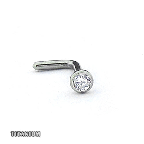 Titanium L bend, sa CZ kristalom veličine 2mm. Osovina savijena u L oblik za sigurnije nošenje nakita u nosu. Debljina osovine 1mm. Diskretan nakit visokog kvaliteta.