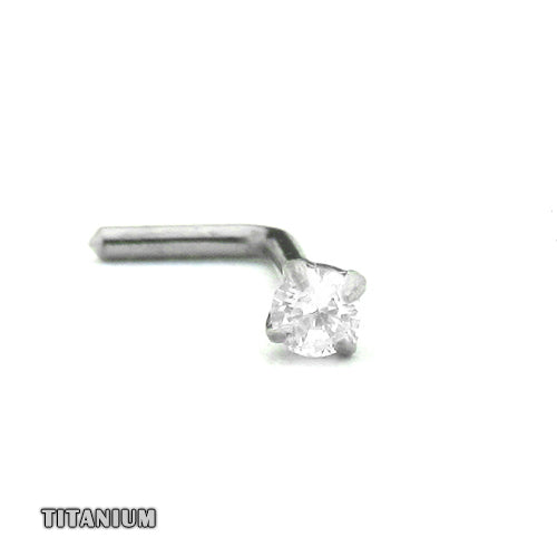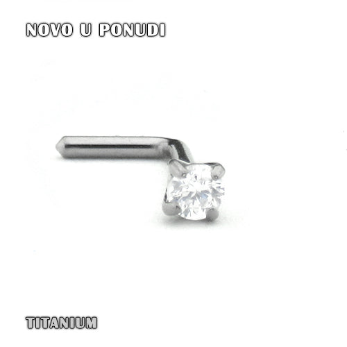 Titanium L bend, sa CZ kristalom veličine 2mm. Osovina savijena u L oblik za sigurnije nošenje nakita u nosu. Debljina osovine 0,8mm.