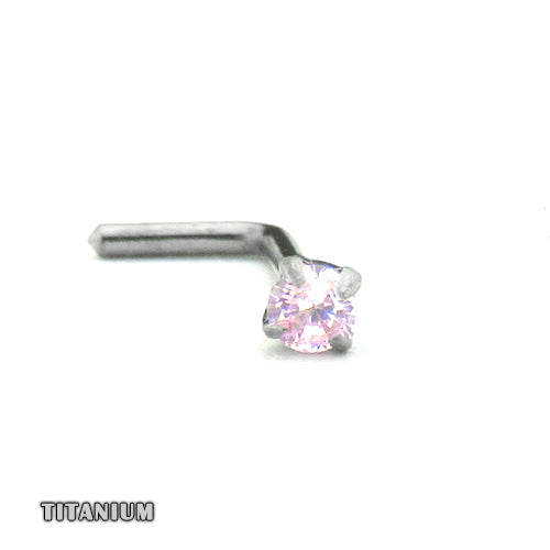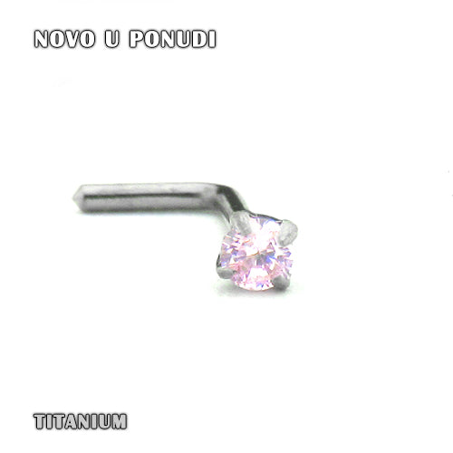 Titanium L bend, sa Roze CZ kristalom veličine 2mm. Osovina savijena u L oblik za sigurnije nošenje nakita u nosu. Debljina osovine 0,8mm.