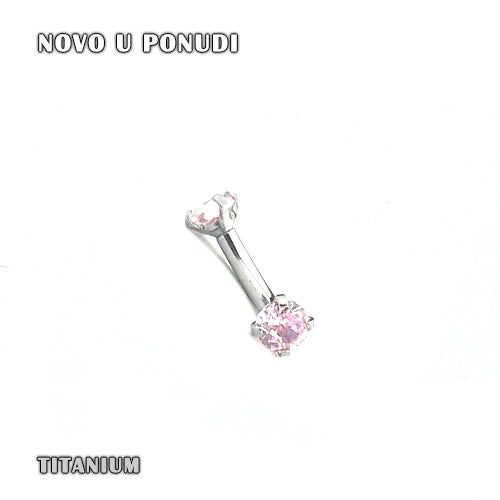 Titanium sa Roze CZ kristalima veličine 3mm. Debljina osovine 1,2mm, dužina osovine 6mm. Unutrašnji navoj na osovini za lakše postavljanje vrhova nakita. Može da se koristi kao pirsing za obrvu i uvo.